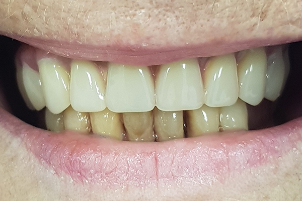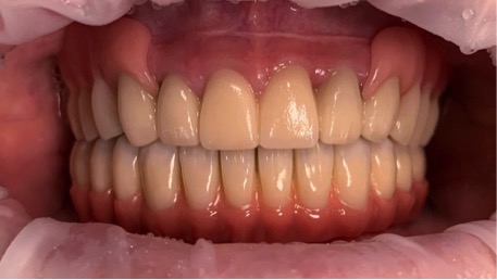 Постоянная керамокомпозитная конструкция на фрезерованном титановом основании «All-on-4», включающая имплантаты и элементы протезирования Osstem, а также временный акриловый протез