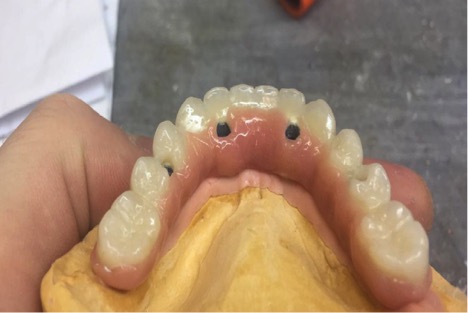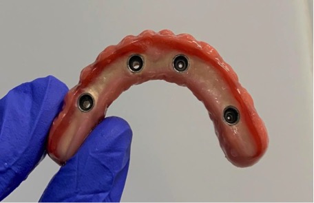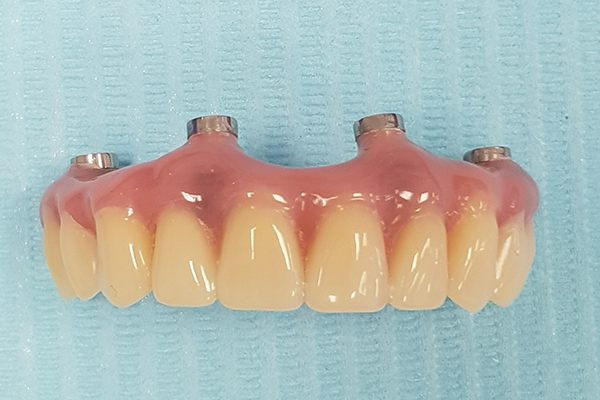 Постоянная керамокомпозитная конструкция на фрезерованном титановом основании «All-on-4», включающая имплантаты и элементы протезирования AnyOne, а также временный акриловый протез