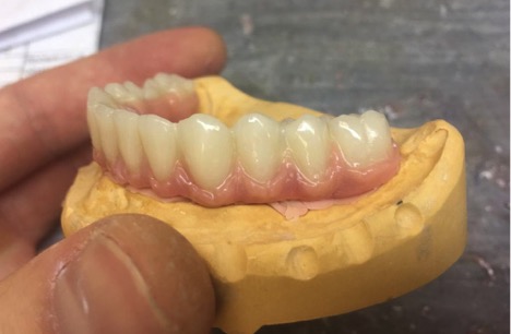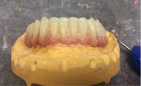 Постоянная керамокомпозитная конструкция на фрезерованном титановом основании «All-on-4», включающая имплантаты и элементы протезирования A.B. Dental, а также временный акриловый протез