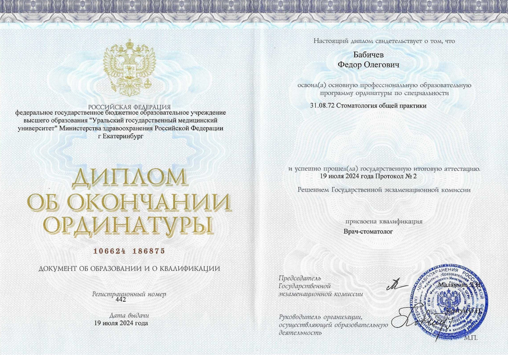 2024 г. - Ординатура в Уральском государственном медицинском университете по специальности «Стоматология общей практики».
