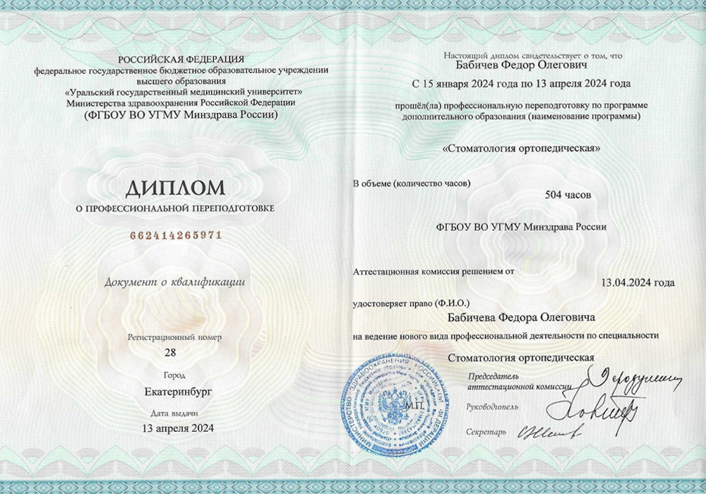 2024 г. - Профессиональная переподготовка Уральском государственном медицинском университете по специальности «Стоматология ортопедическая».