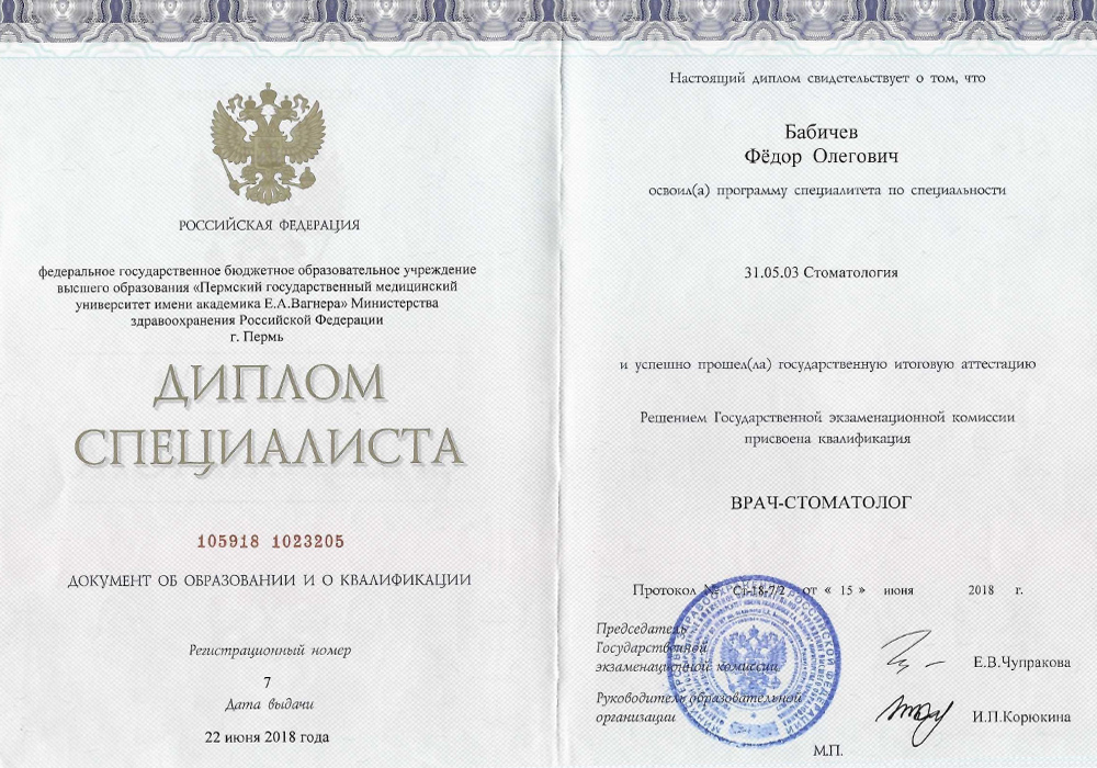 2018 г. - Окончил Пермский государственный медицинский университет по специальности «Стоматология».