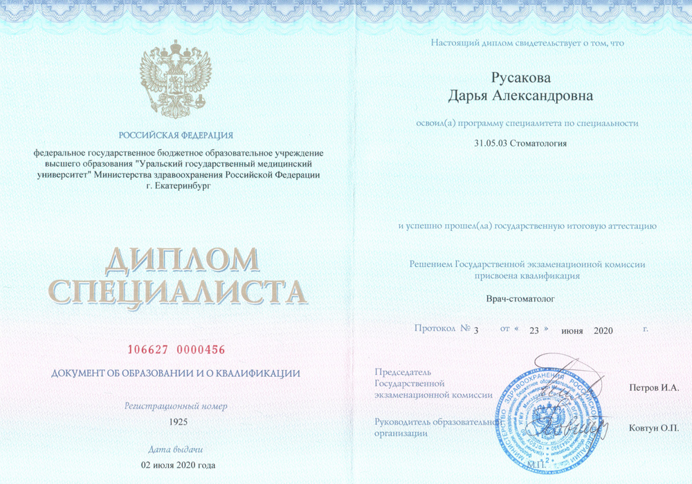 2020 г. - Окончила Уральский государственный медицинский университет по специальности «Стоматология».