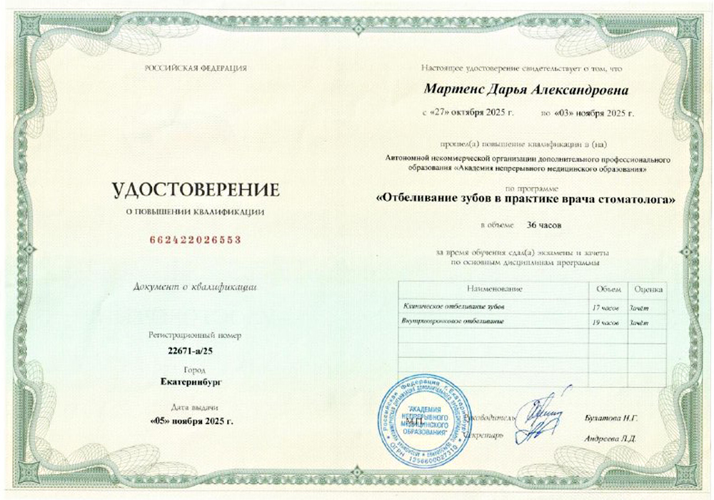 2022 г. - Повышение квалификации в Институте дополнительного профессионального образования по специальности «Стоматология общей практики».