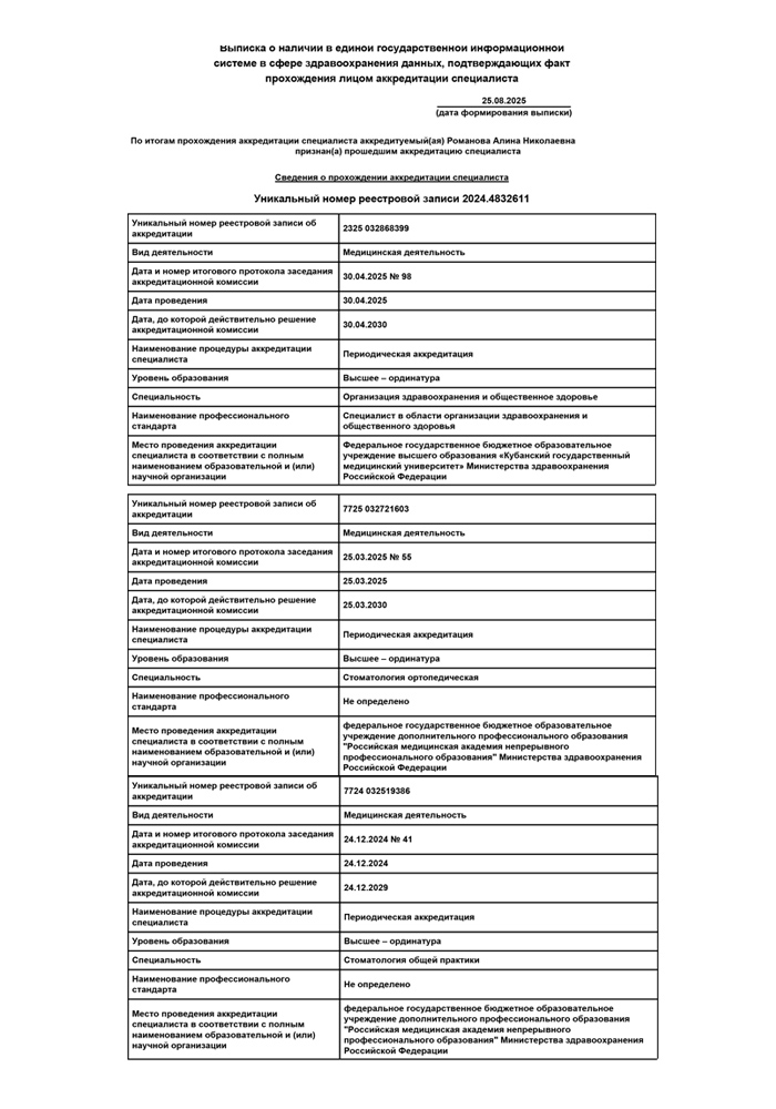 2024 г. - Повышение квалификации в Российской медицинской академии непрерывного профессионального образования по специальности «Стоматология общей практики».