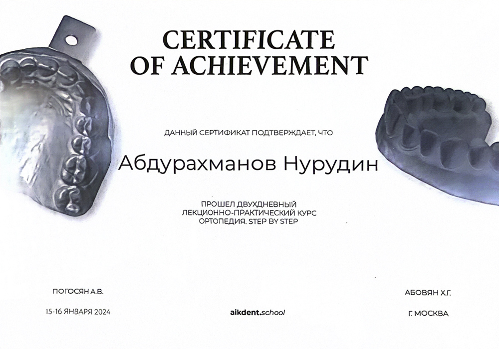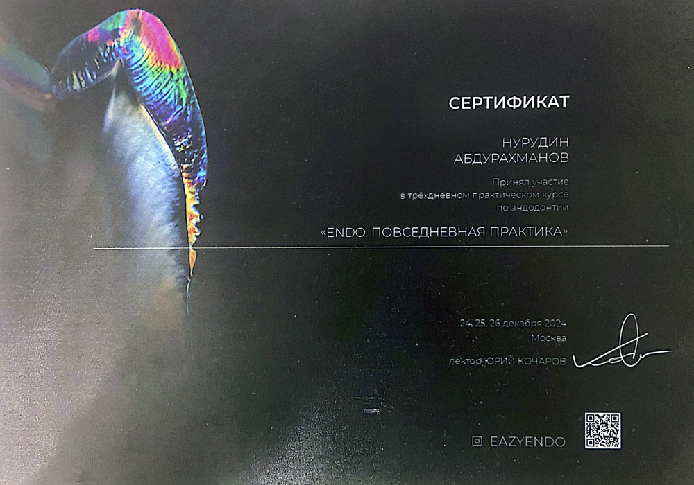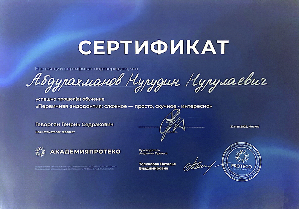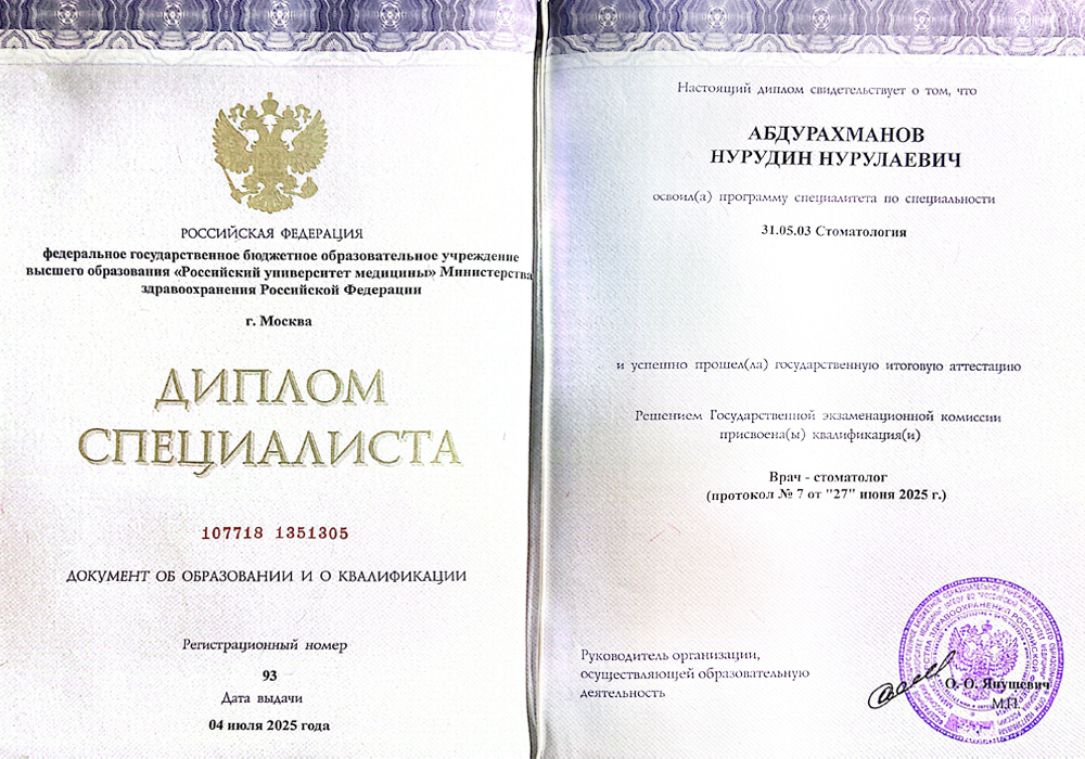 2025 г. - Окончил Российский университет медицины по специальности «Стоматология».