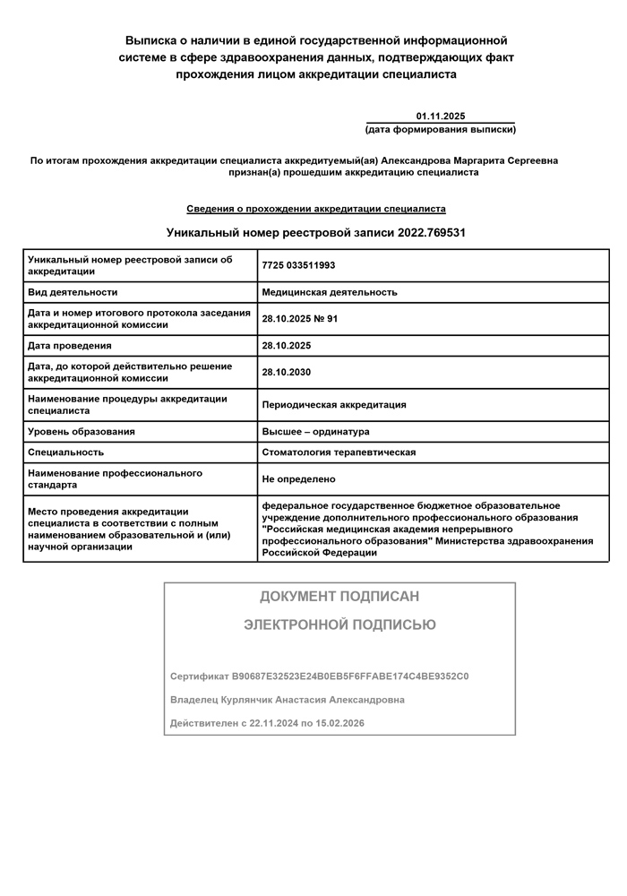 2025 г. - Повышение квалификации в Российской медицинской академии непрерывного профессионального образования по специальности «Стоматология терапевтическая».