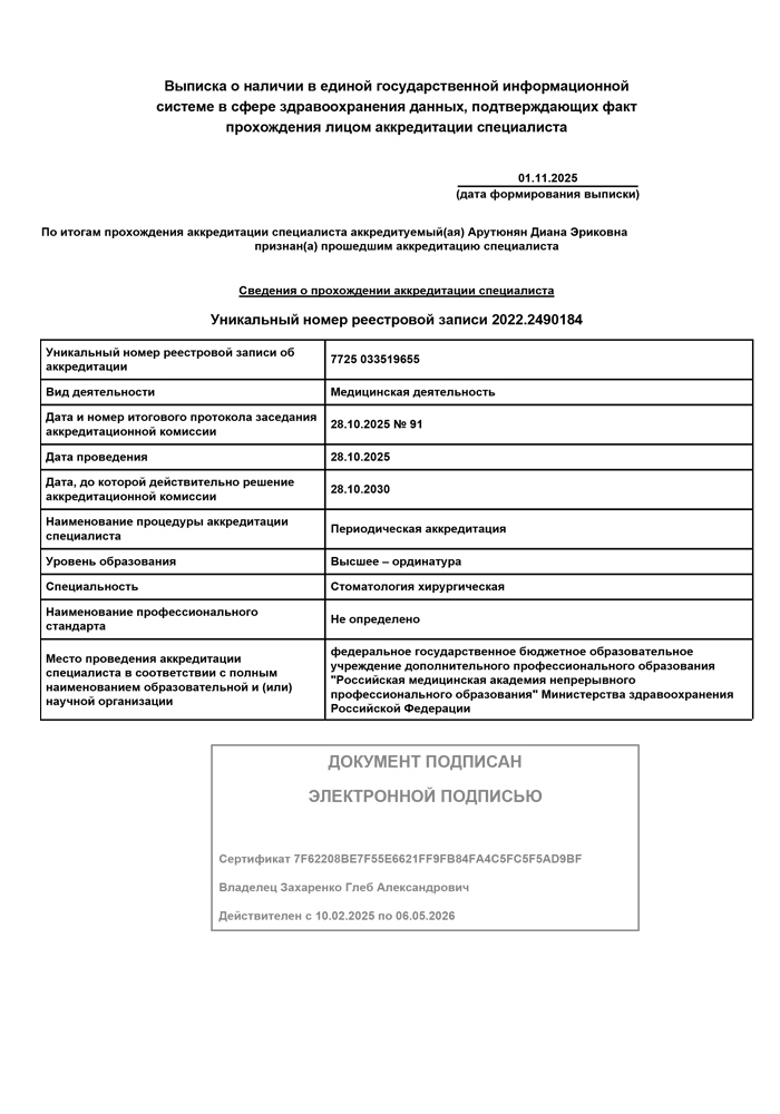 2025 г. - Повышение квалификации в Российской медицинской академии непрерывного профессионального образования по специальности «Стоматология хирургическая».