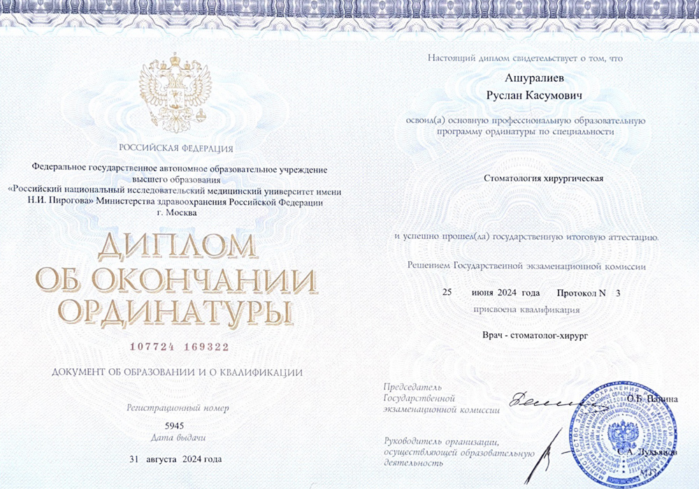 2024 г. - Ординатура в Челюстно-лицевом госпитале для ветеранов войн Российского национального исследовательского медицинского университета им.Н.И.Пирогова по специальности «Стоматология хирургическая».