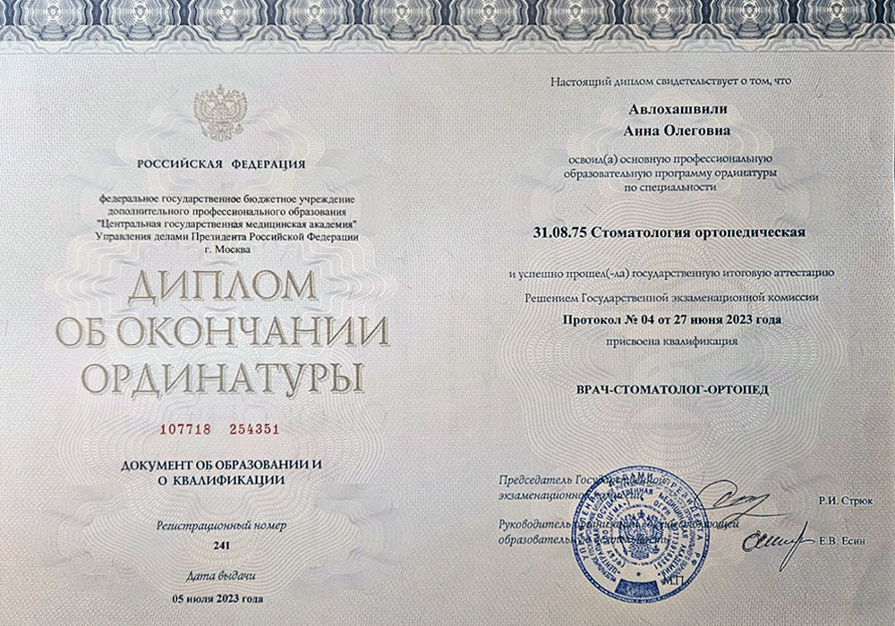 2023 г. - Ординатура в Центральной государственной медицинской академии Управления делами Президента РФ по специальности «Стоматология ортопедическая».