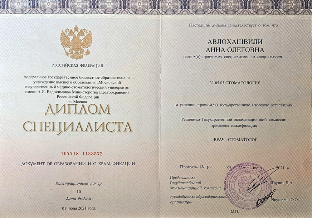 2021 г. - Окончила Московский государственный медико-стоматологический университет им.А.И.Евдокимова по специальности «Стоматология».