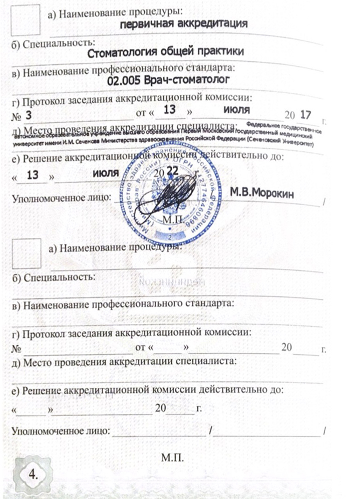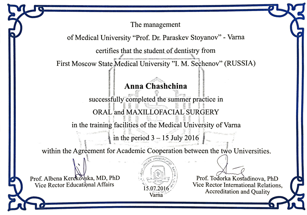 2017 г. - Окончила с отличием Первый Московский государственный медицинский университет им.И.М. Сеченовапо специальности «Стоматология общей практики».