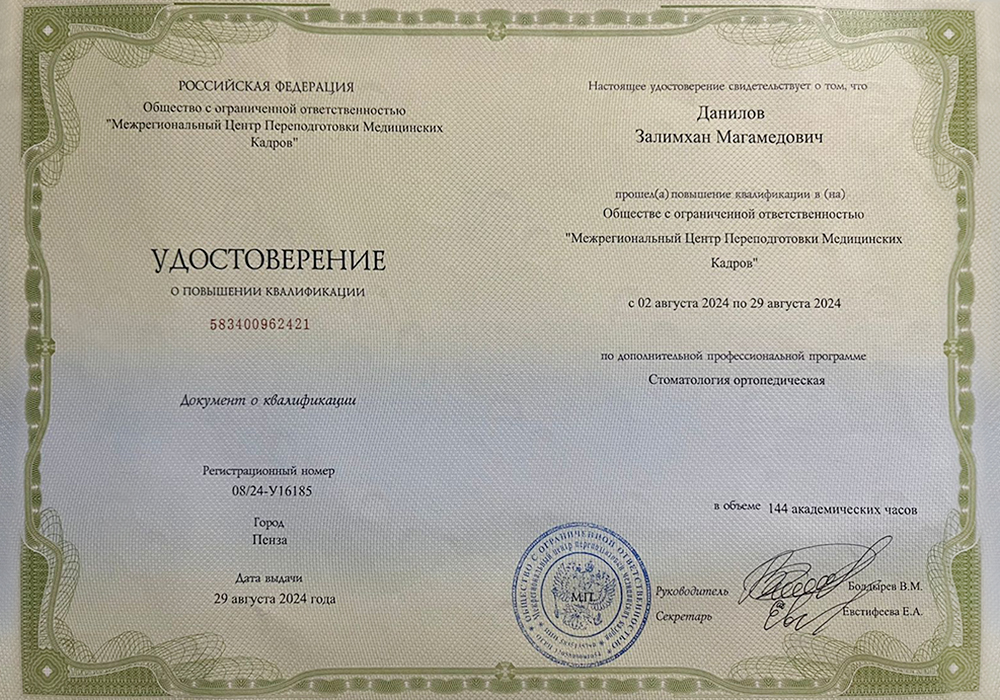 2024 г. - Повышение квалификации в Межрегиональном центре переподготовки медицинских кадров по специальности «Стоматология ортопедическая».