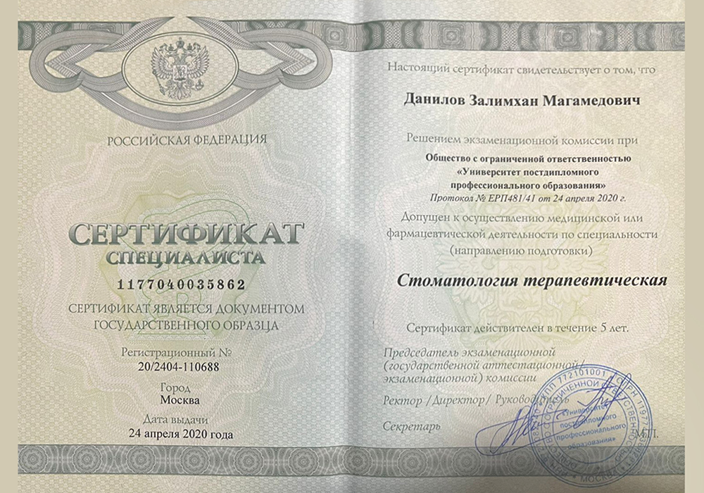 2020 г. - Повышение квалификации в Университете постдипломного профессионального образования по специальности «Стоматология терапевтическая».