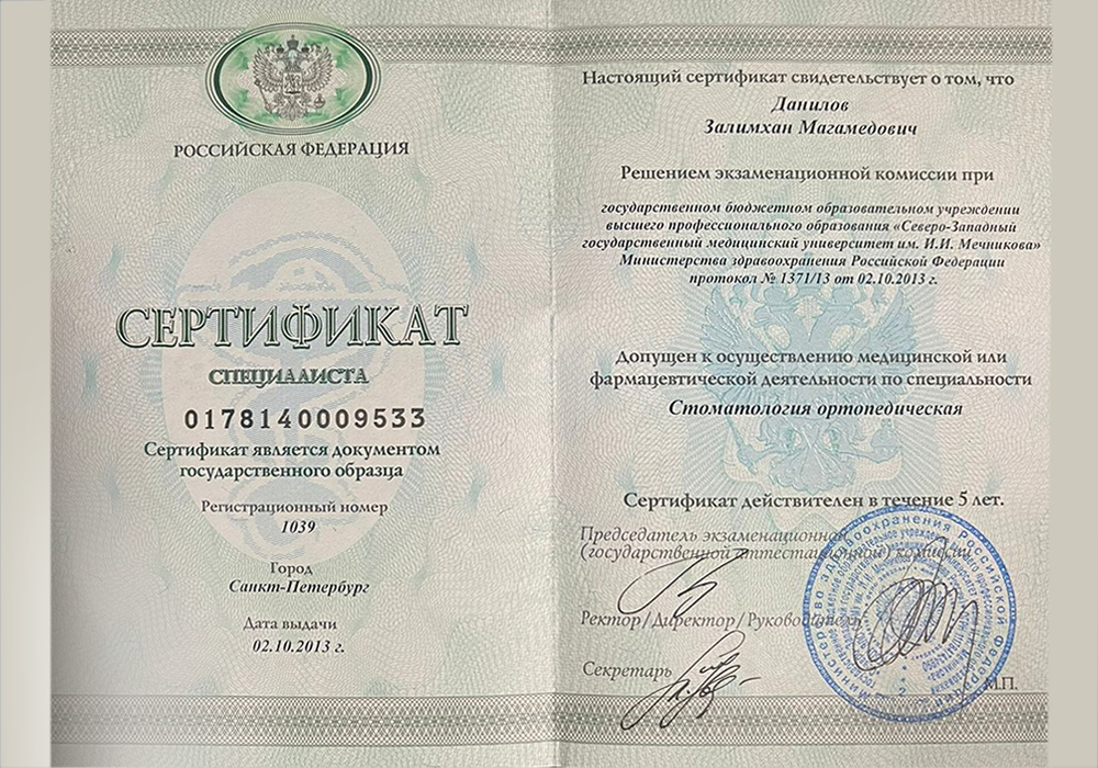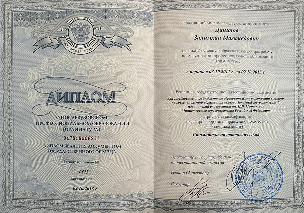 2013 г. - Ординатура в Северо-Западном государственно медицинском университете им.И.И.Мечникова по специальности «Стоматология ортопедическая».