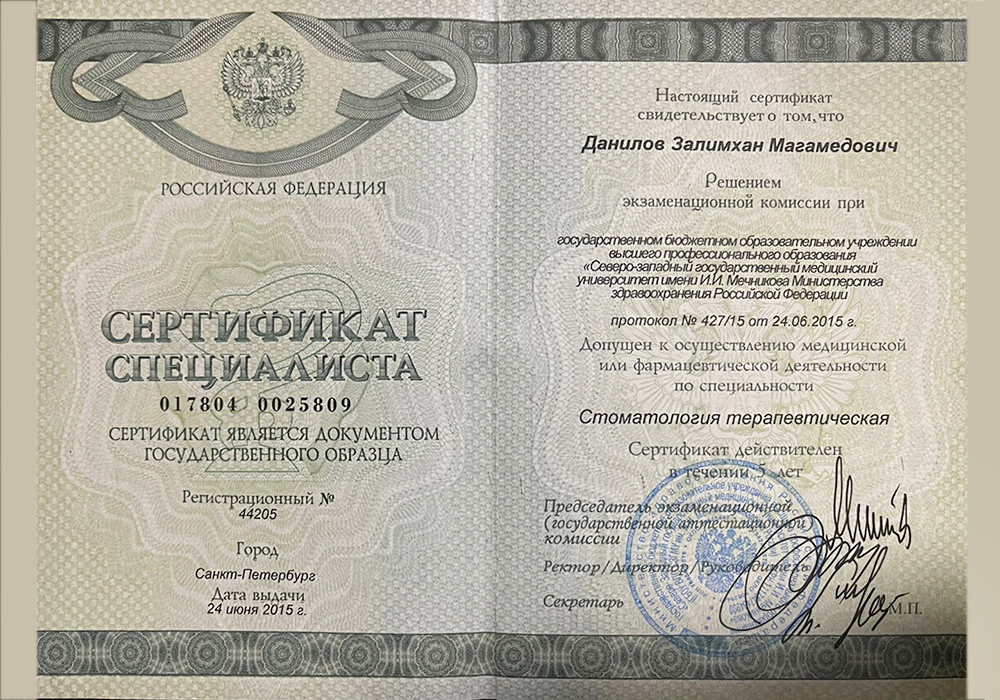 2015 г. - Профессиональная переподготовка в Северо-Западном государственно медицинском университете им.И.И.Мечникова по специальности «Стоматология терапевтическая».