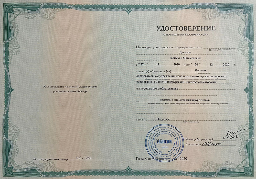 2020 г. - Повышение квалификации в Санкт-Петербургский институт стоматологии последипломного образования по специальности «Стоматология хирургическая».
