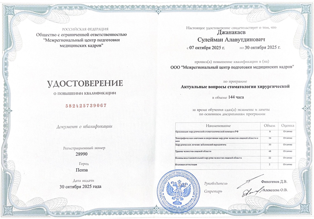 2025 г. - Повышение квалификации в Межрегиональном центре подготовки медицинских кадров по специальности «Стоматология хирургическая».