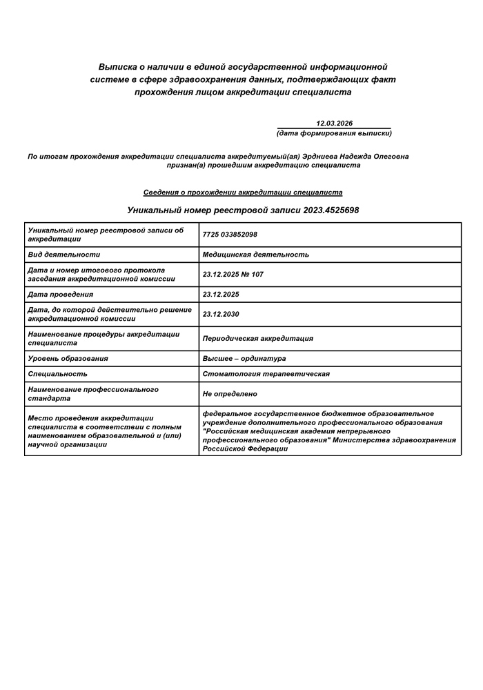 2025 г. - Повышение квалификации в Российской медицинской академии непрерывного профессионального образования по специальности «Стоматология терапевтическая».