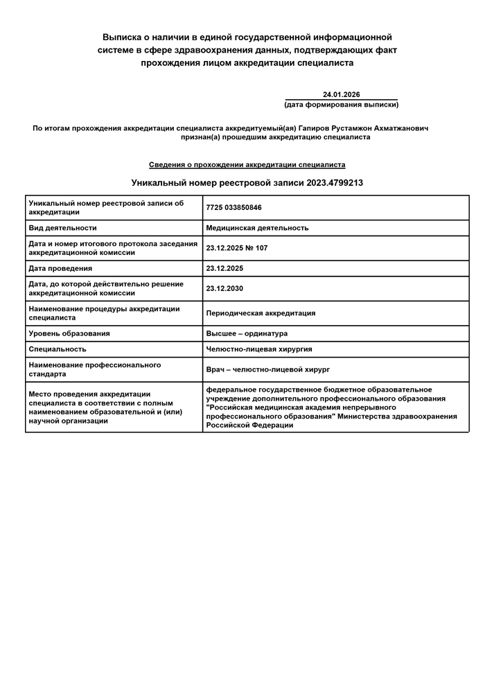 2025 г. - Повышение квалификации в Российской медицинской академии непрерывного профессионального образования по специальности «Челюстно-лицевая хирургия».