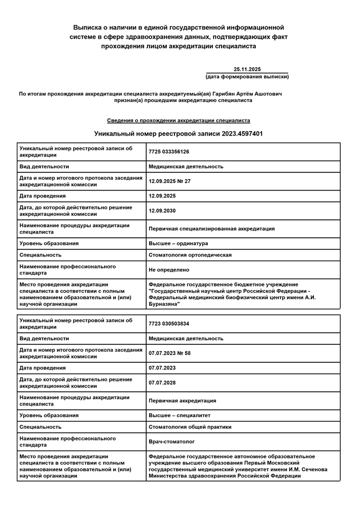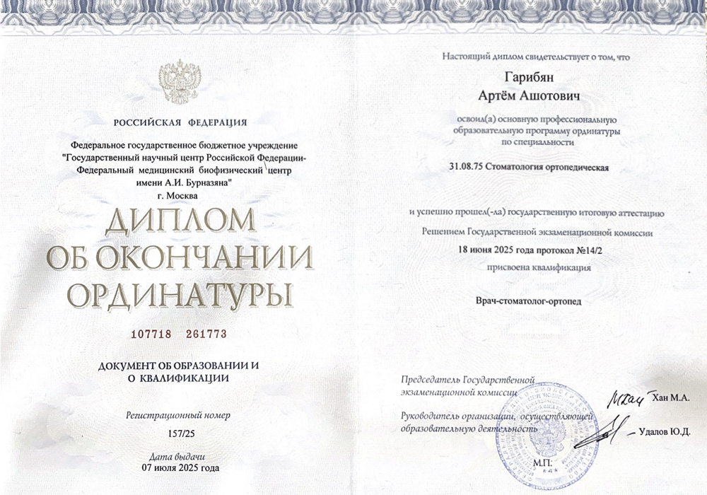 2025 г. - Ординатура на базе Федерального медицинского биофизического центра им.А.И.Бурназяна по специальности «Cтоматология ортопедическая».
