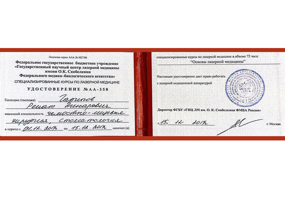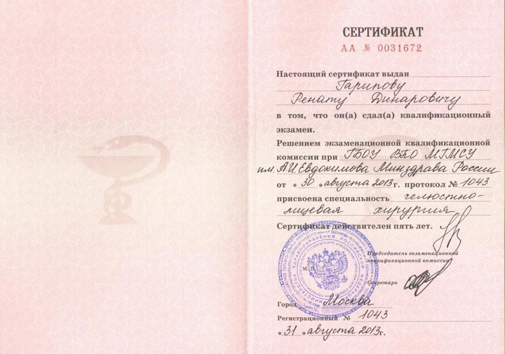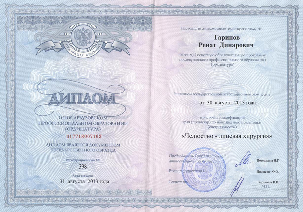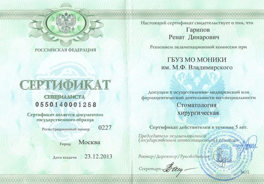 2013 г. - Профессиональная переподготовка на базе Московского областного научно-исследовательского клинического института им.М.Ф.Владимирского по специальности «Стоматология хирургическая».