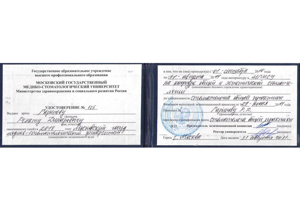 2011 г. - Интернатура на Кафедре общей и эстетической стоматологии Московского государственного медико-стоматологического университета им.А.И.Евдокимова по специальности «Стоматология общей практики».