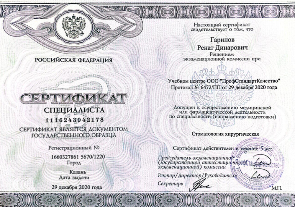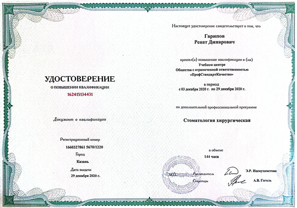 2020 г. - Повышение квалификации в ООО «ПрофСтандартКачество» по специальности «Стоматология хирургическая».