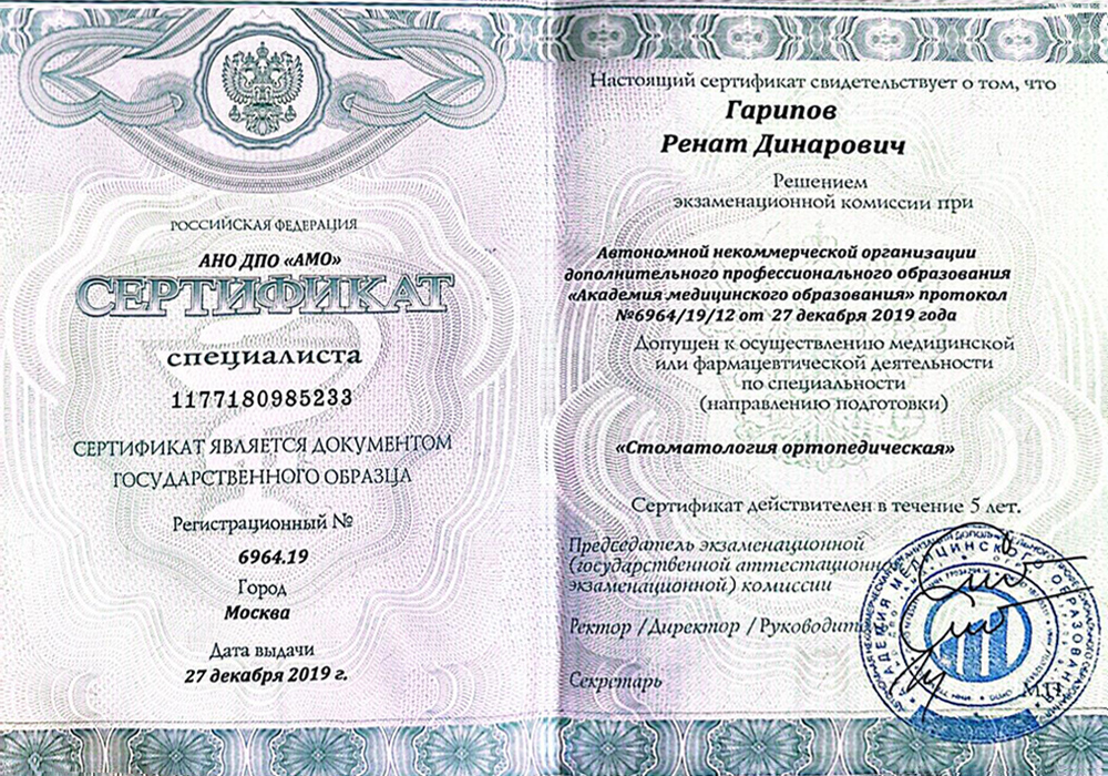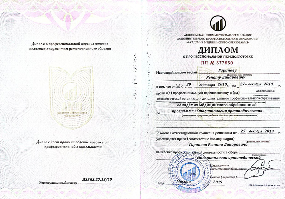 2019 г - Профессиональная переподготовка в Академии медицинского образования по специальности «Стоматология ортопедическая».