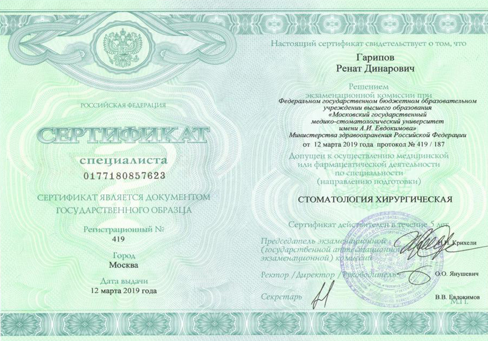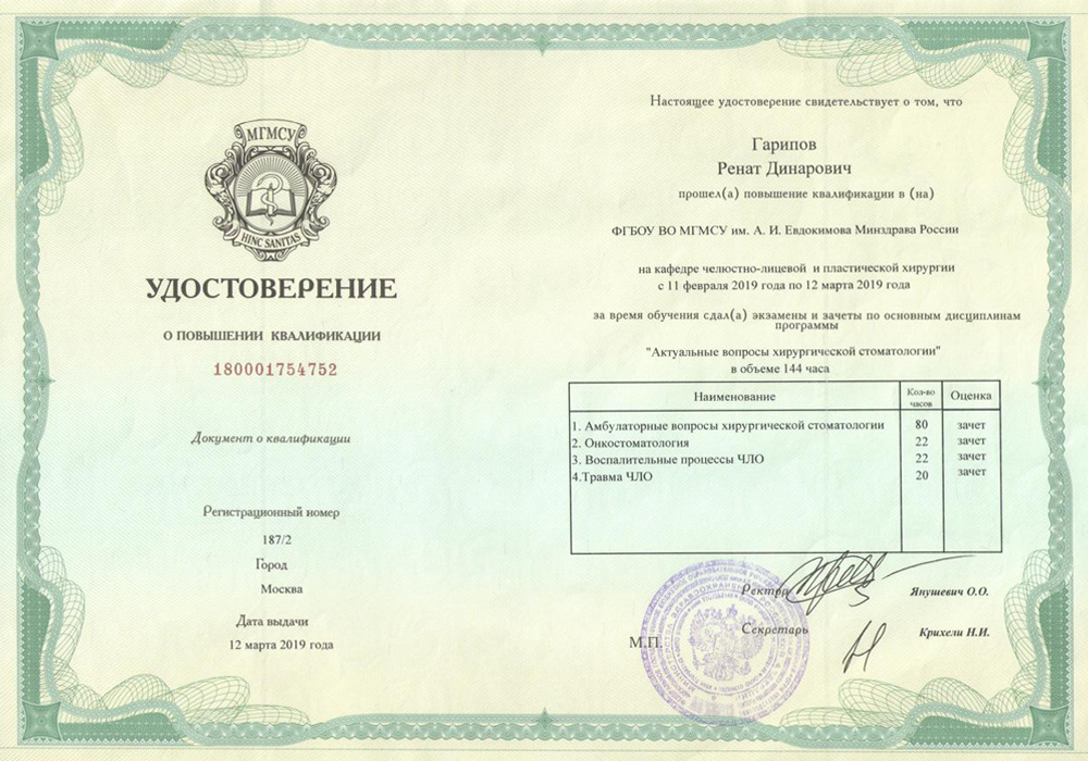 2019 г. - Повышение квалификации в Московском государственном медико-стоматологическом университете им.А.И.Евдокимова по специальности «Стоматология хирургическая».