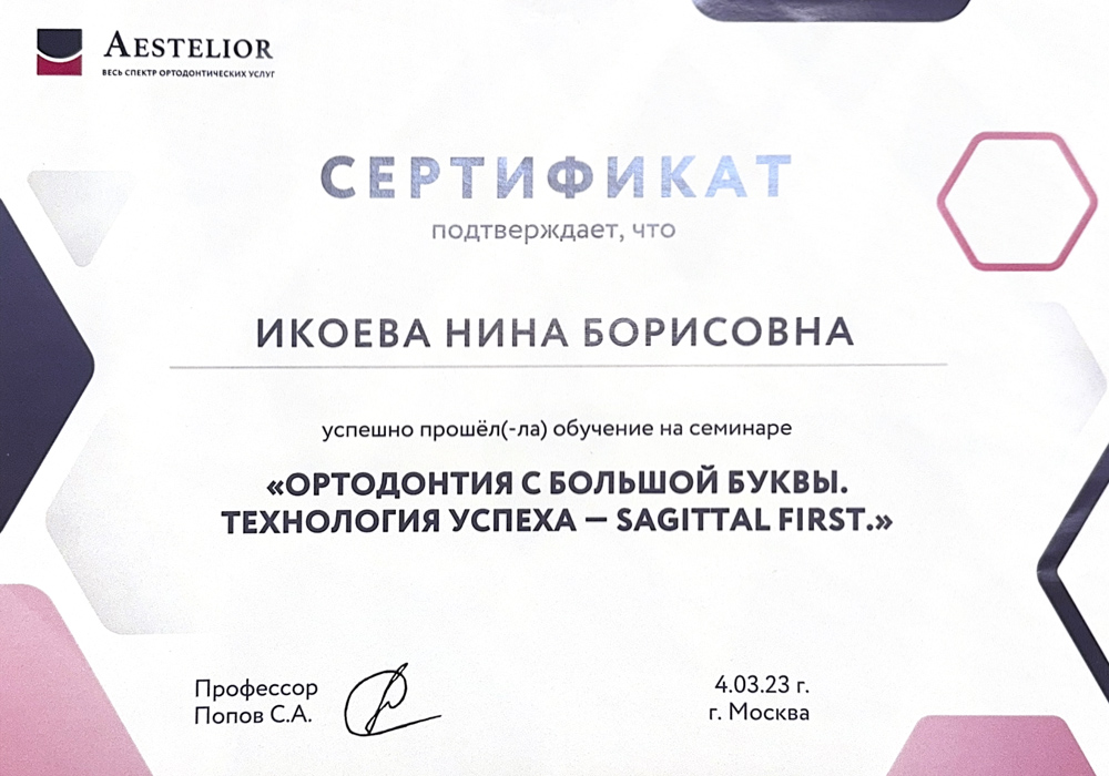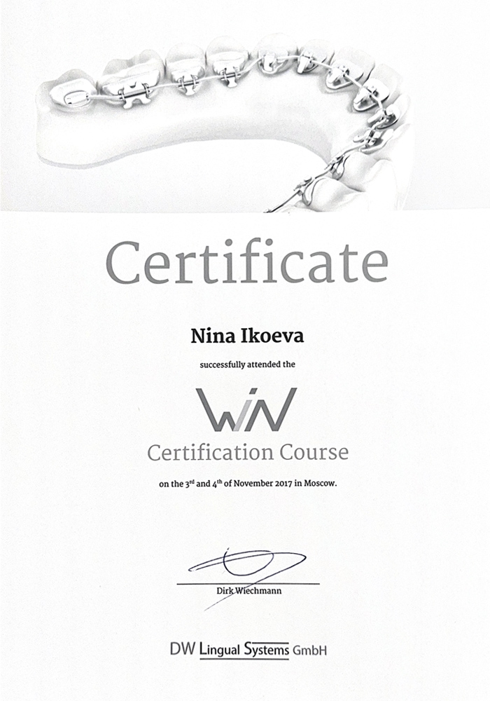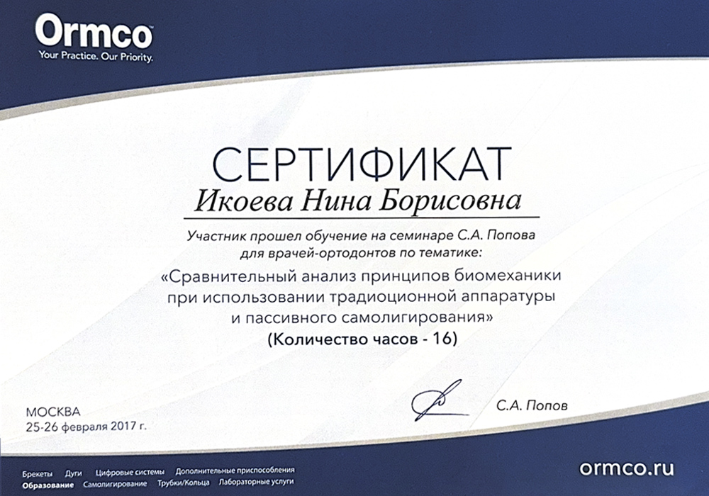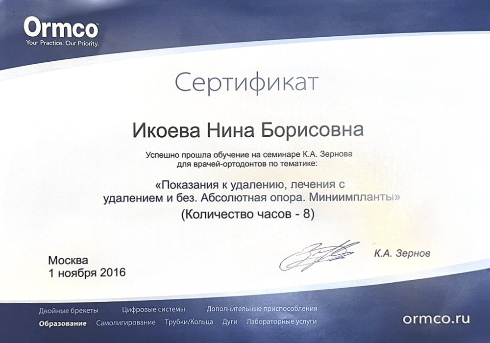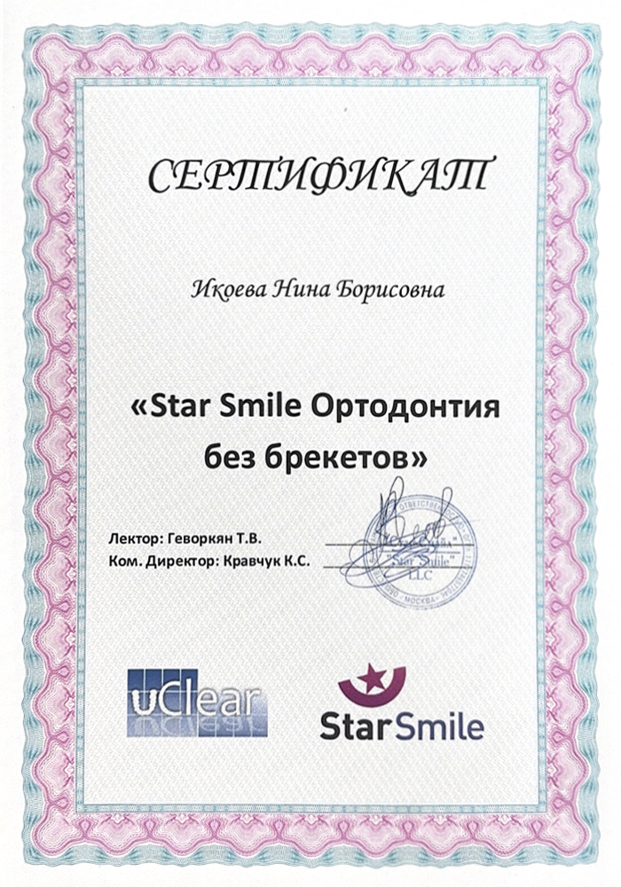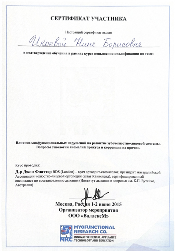 2015 г. - Ординатура в Российском университете дружбы народов по специальности «Ортодонтия».