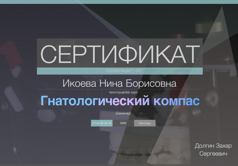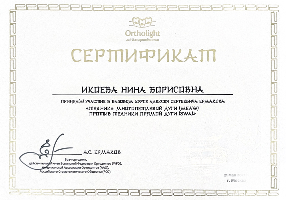 2020 г. - Повышение квалификации в Многопрофильном учебном центре дополнительного профессионального образования «Ортодонтия» по специальности «Ортодонтия».