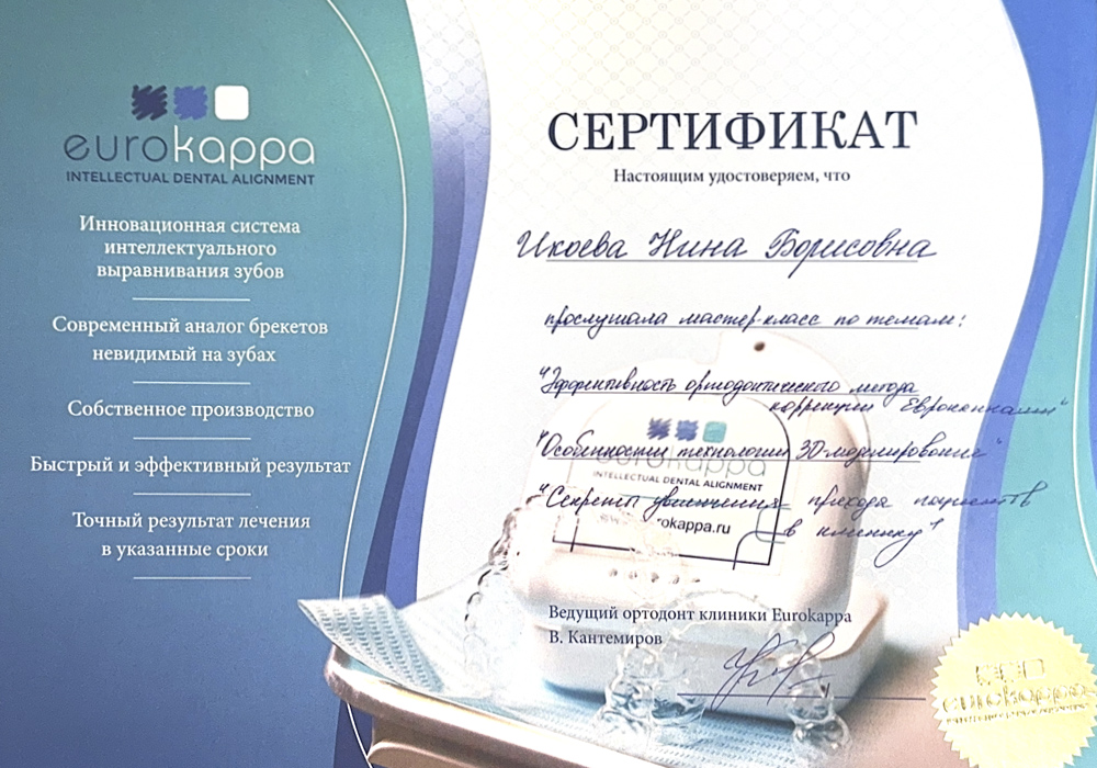- «Эффективность ортодонтическрго метода коррекции еврокаппами», Euro kappa;