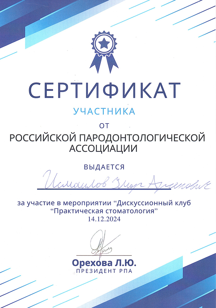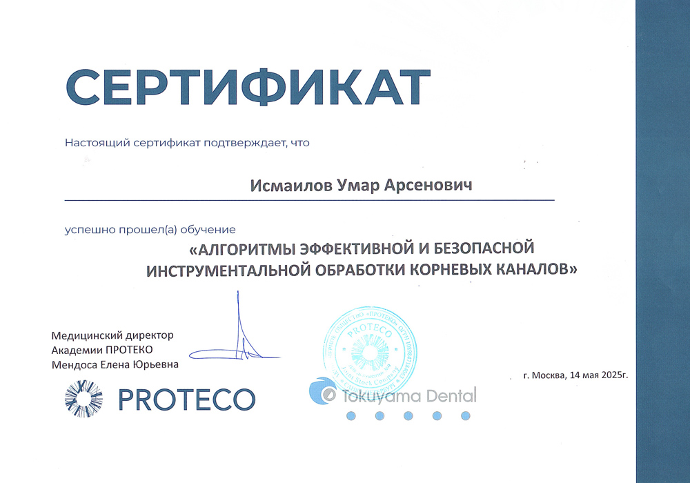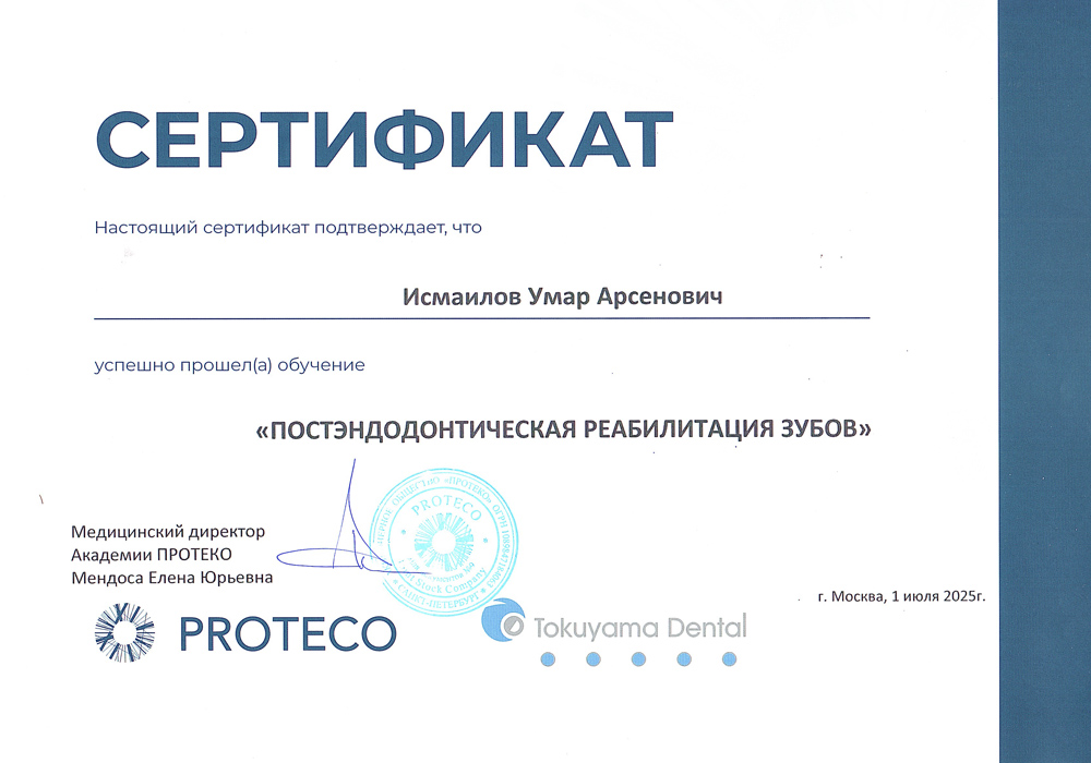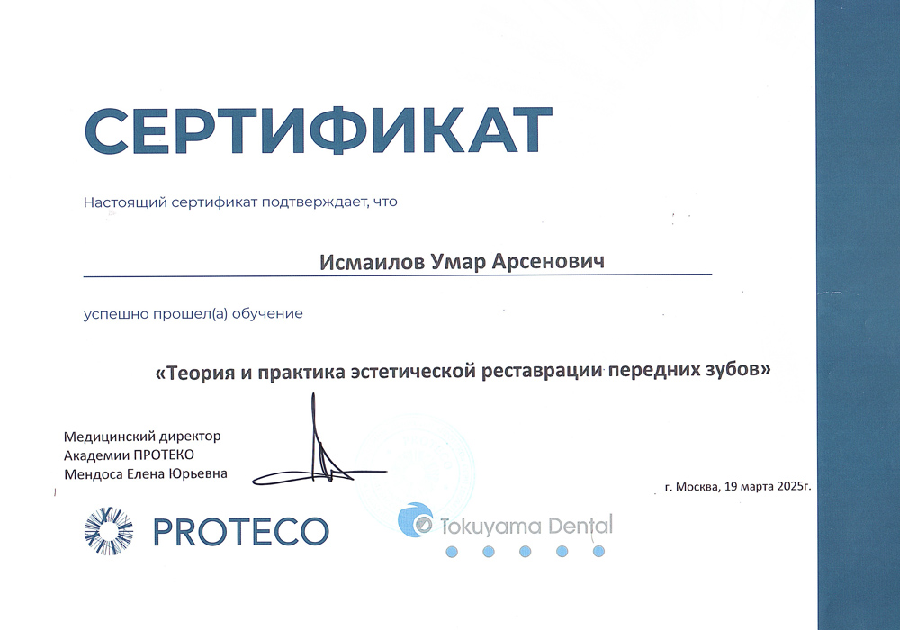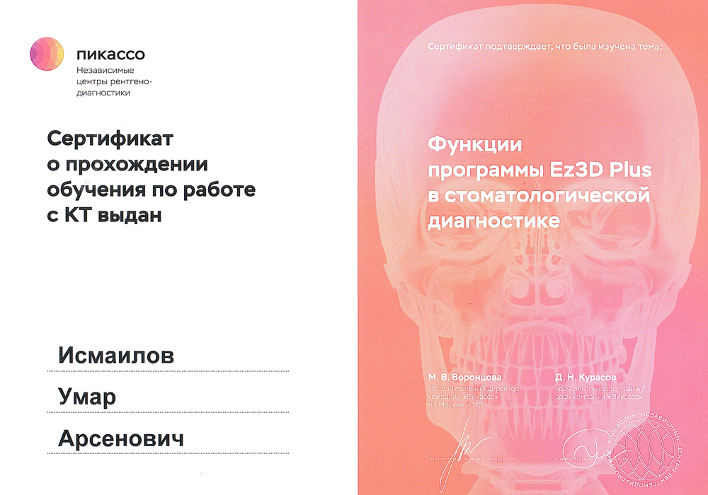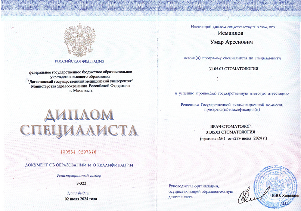 2024 г. - Окончил Дагестанский государственный медицинский университет по специальности «Стоматология».