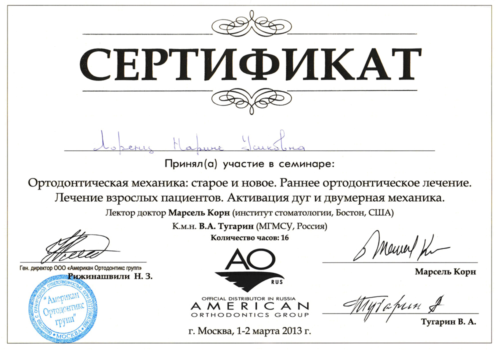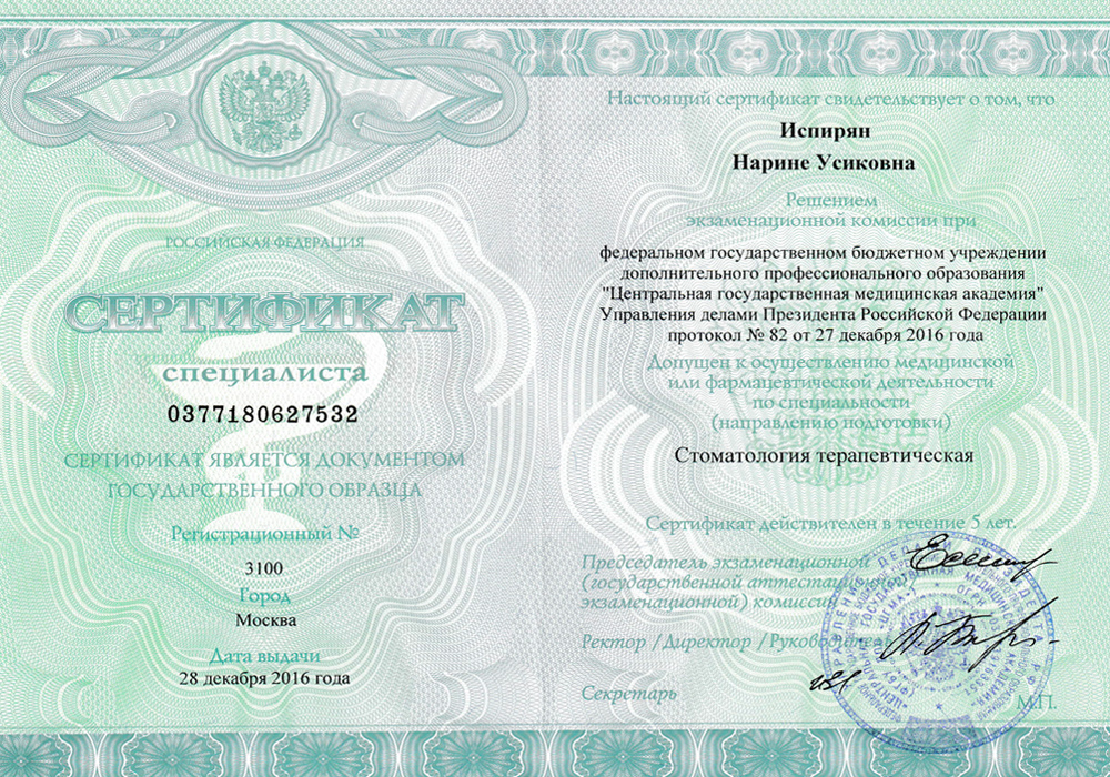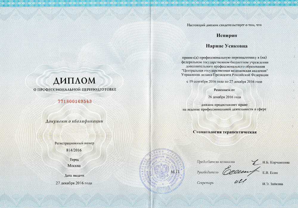 2016 г. - Профессиональная переподготовка в Центральной государственной медицинской академии по специальности «Стоматология терапевтическая».