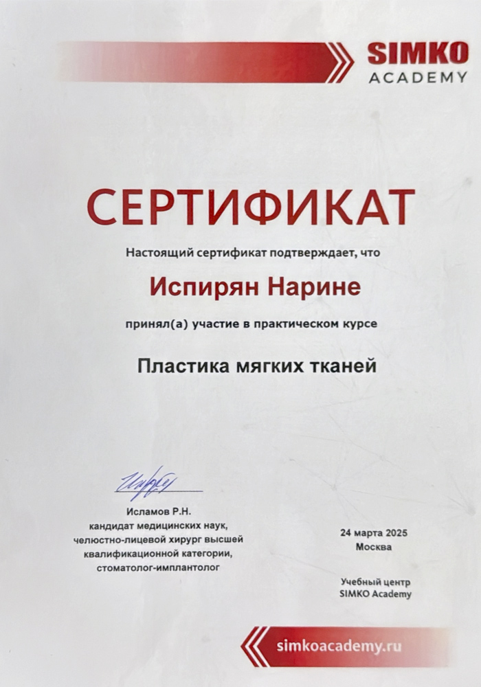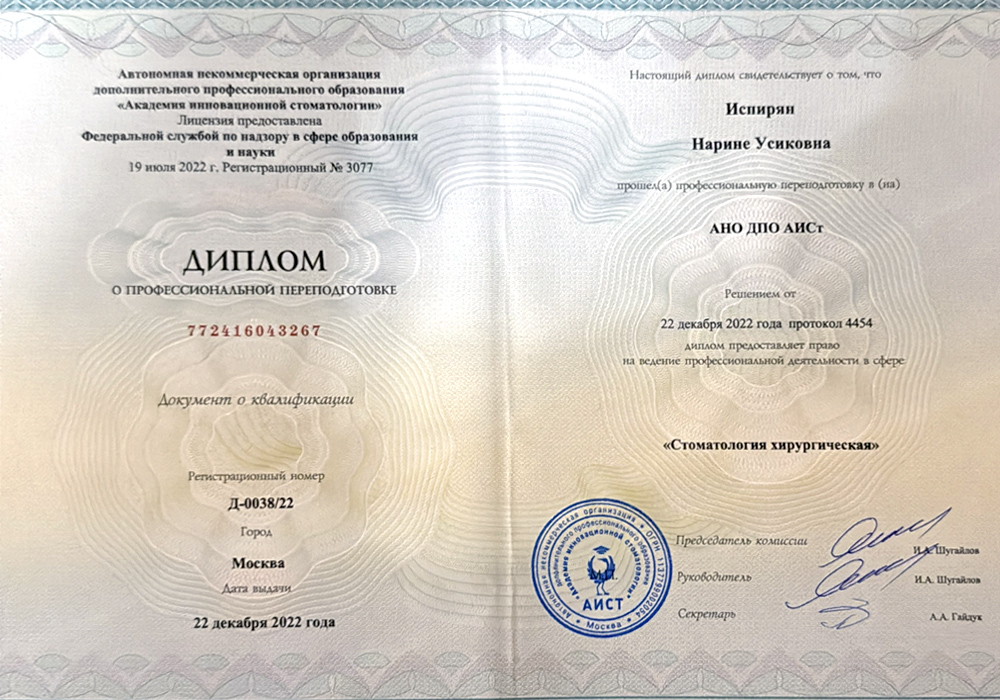 2022 г. - Профессиональная переподготовка в Академии инновационной стоматологии по специальности «Стоматология хирургическая».