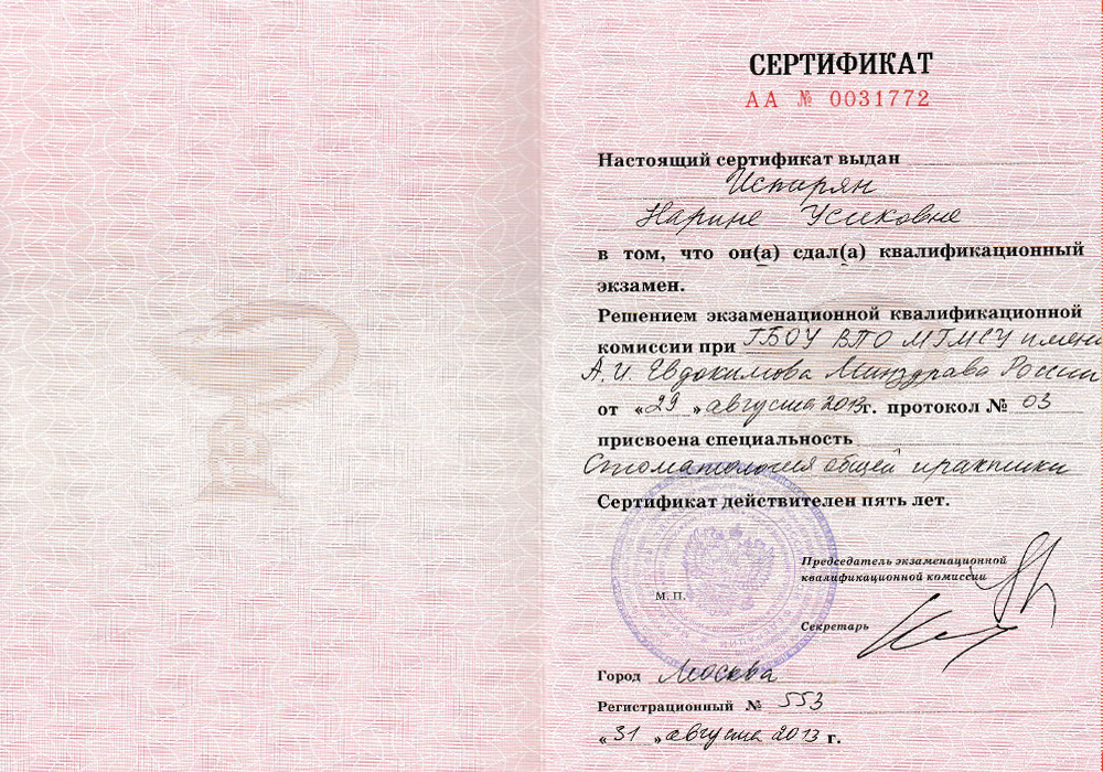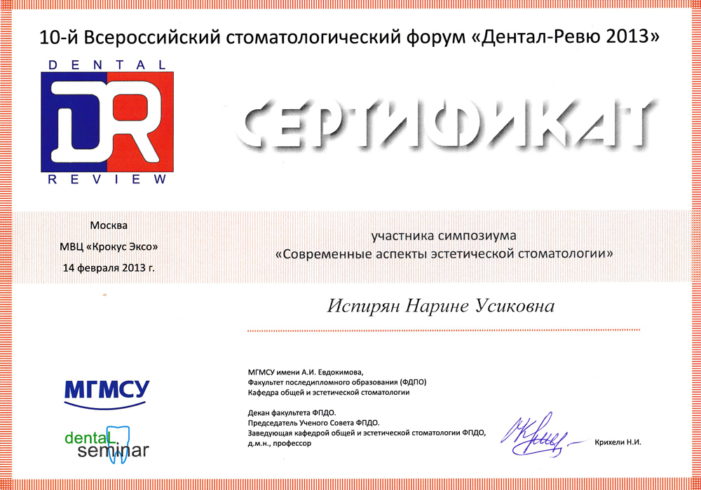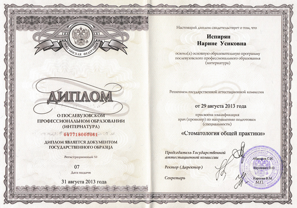 2013 г. - Интернатура в Московском государственном медико-стоматологическом университете им.А.И.Евдокимова по специальности «Стоматология общей практики».