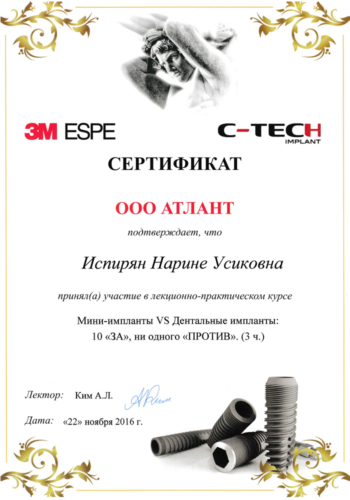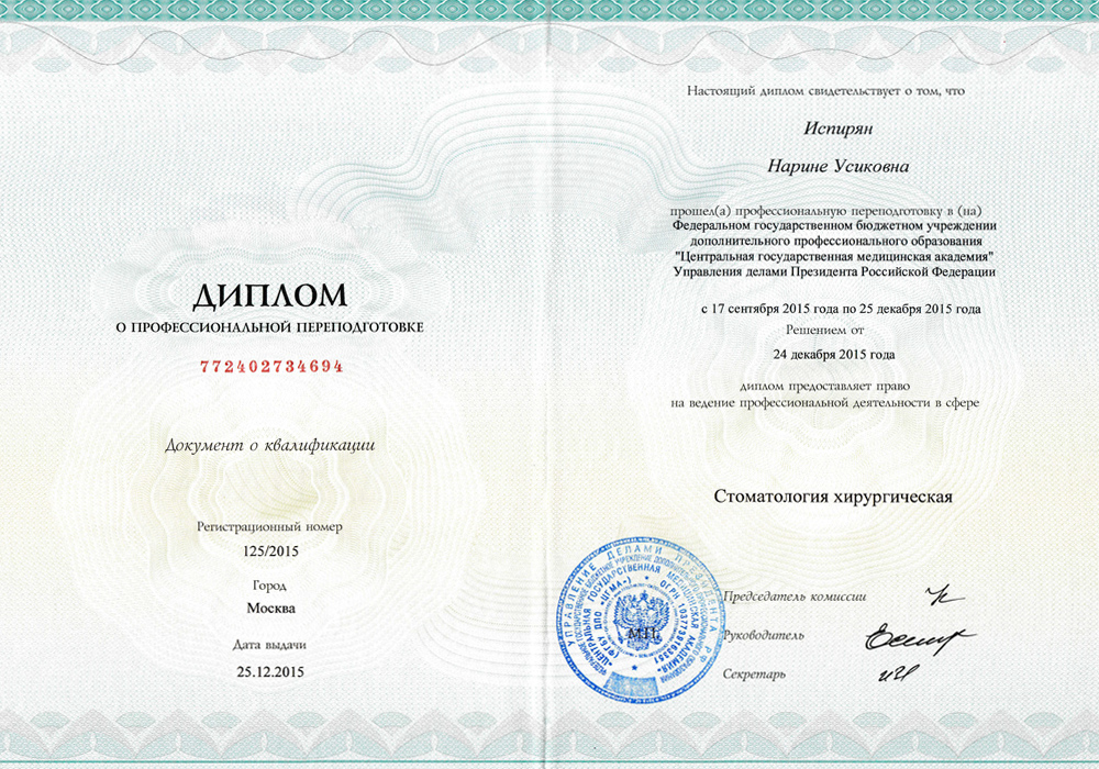 2015 г. - Профессиональная переподготовка в Центральной государственной медицинской академии по специальности «Стоматология хирургическая».