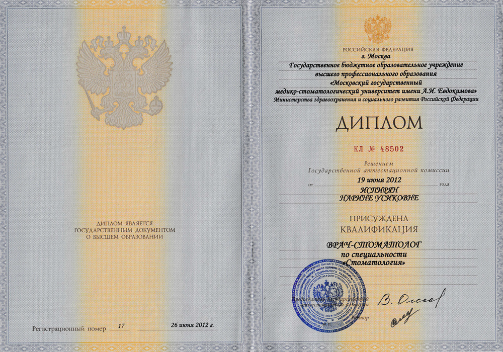2012 г. - Окончила Московский государственный медико-стоматологический университет им.А.И.Евдокимова по специальности «Стоматология».