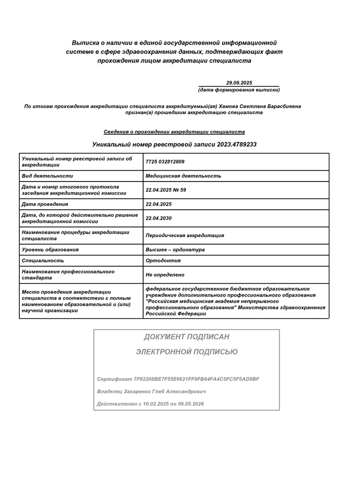2025 г. - Повышение квалификации в Российской медицинской академии непрерывного профессионального образования по специальности «Ортодонтия».
