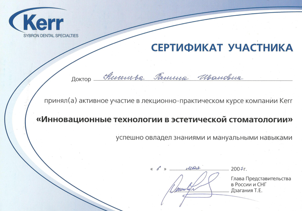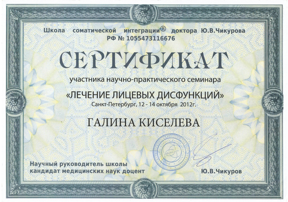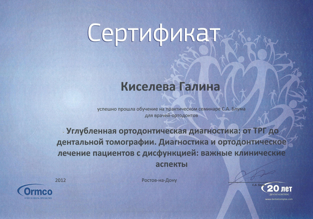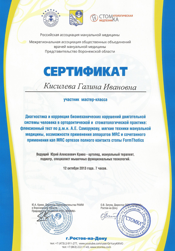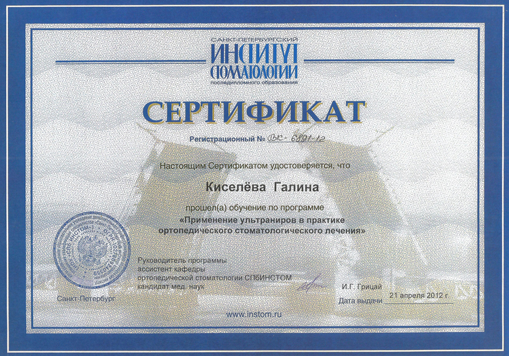 2013 г. - Повышение квалификации в Северо-Западном государственном медицинском университете им.И.И. Мечникова по специальности «Стоматология ортопедическая».