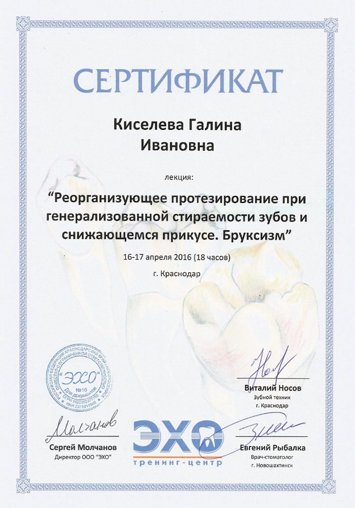 - «Сложное протезирование (бюгельные протезы с фиксацией на аттачменах, балочные конструкции, телескопические коронки и т.д.)», СПбИНСТОМ;