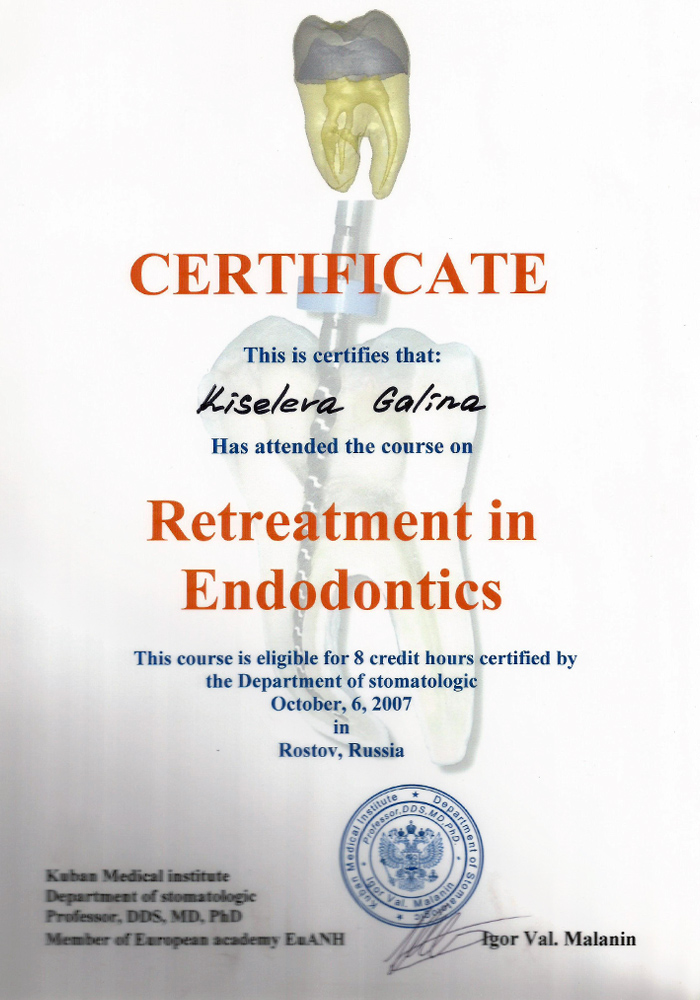 2006 г. - Повышение квалификации в Ростовском государственном медицинском университете «Стоматология хирургическая».