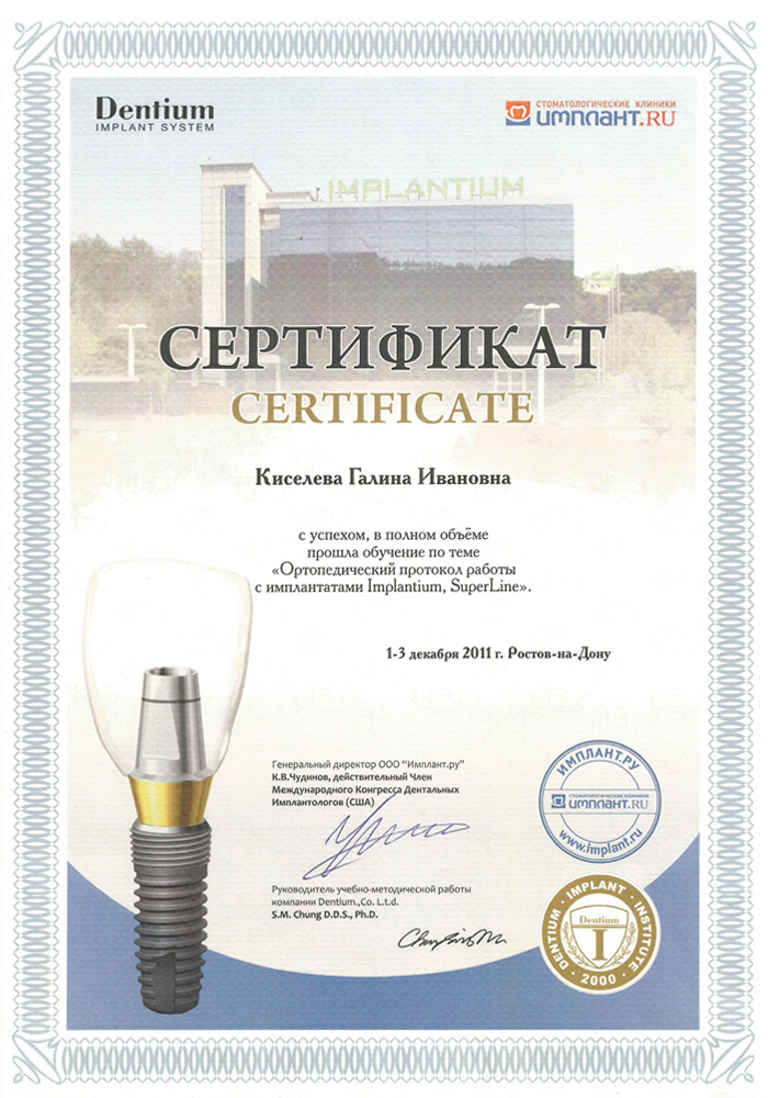 - «Ортопедическая стоматология», сертификат, СПб институт стоматологии;