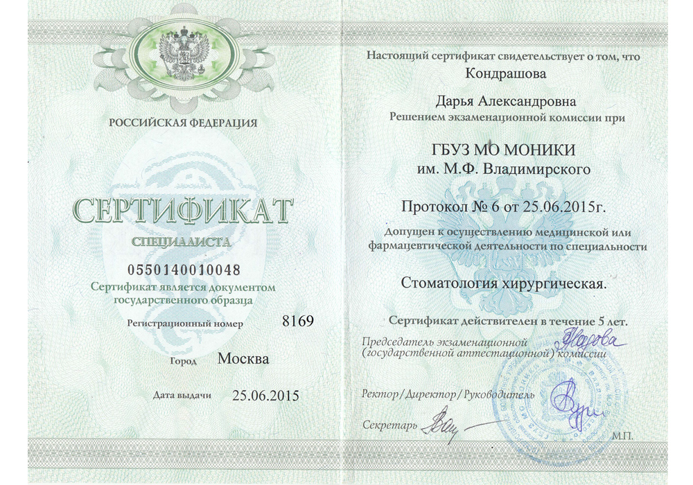 2015 г. - Профессиональная переподготовка на базе Московского областного научно-исследовательского клинического института им. М.Ф. Владимирского по специальности «Стоматология хирургическая».