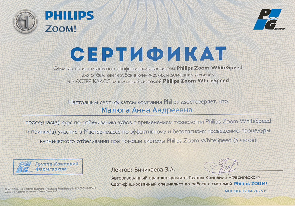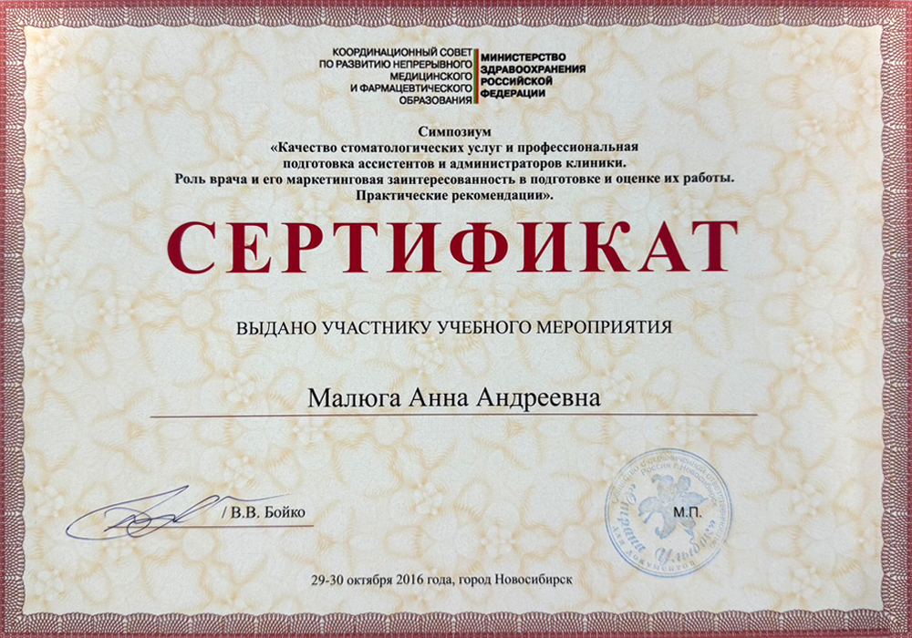 2021 г. - Ординатура на Кафедре хирургической стоматологии, стоматологической имплантации и челюстно-лицевой хирургии Новосибирского государственного медицинского университета по специальности «Стоматология хирургическая».