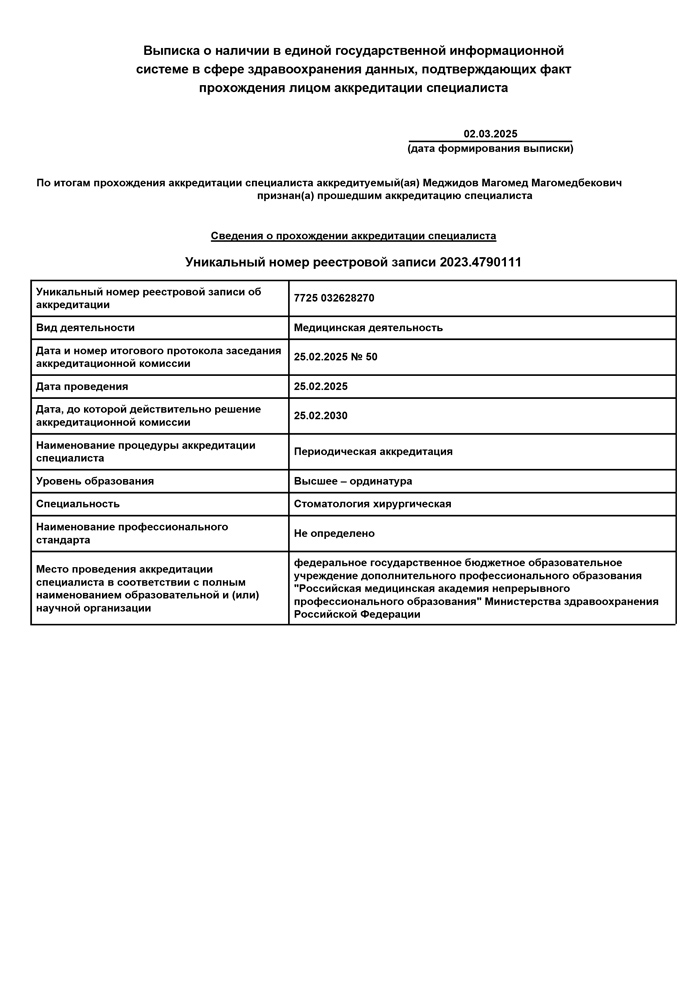 2025 г. - Повышение квалификации в Российской медицинской академии непрерывного профессионального образования по специальности «Стоматология хирургическая».