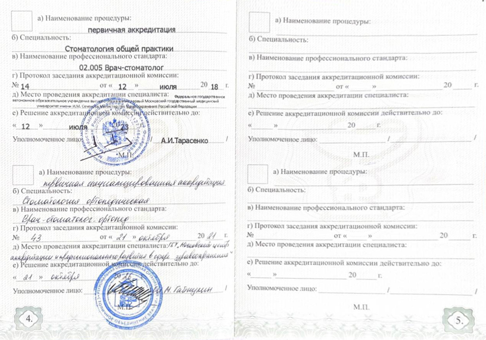 2020 г. - Ординатура вФедеральном медико-биологическом агентстсве России по специальности «Стоматология ортопедическая», г.Москва.