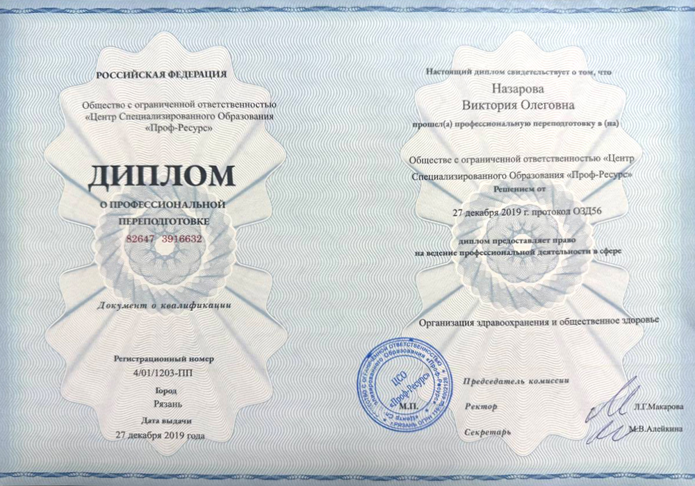 2019 г. - Профессиональная переподготовка на кафедре «Общественного здоровья, здравоохранения и гигиены» по программе «Организация здравоохранения и общественное здоровье».