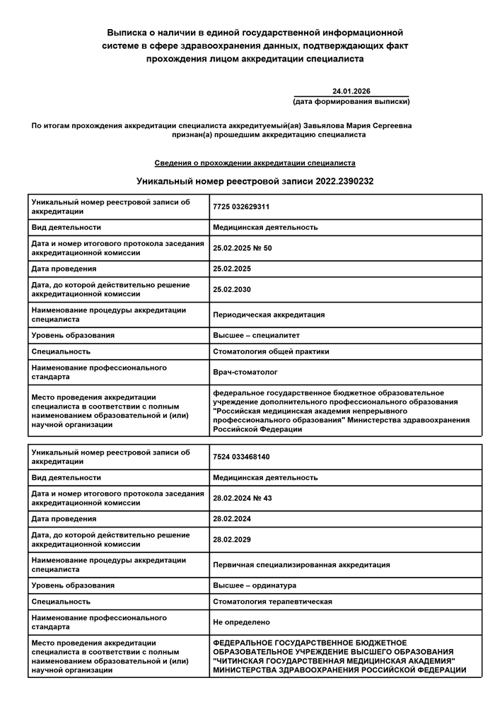2025 г. - Повышение квалификации в Российской медицинской академии непрерывного профессионального образования по специальности «Стоматология общей практики».